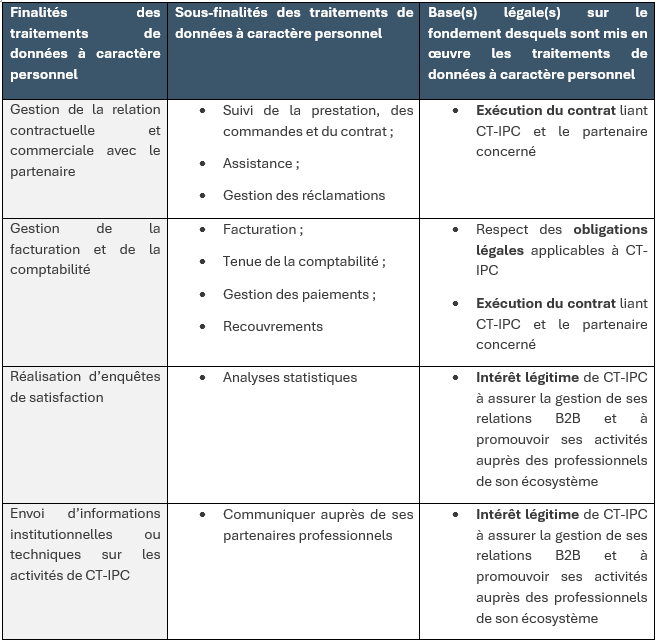 Ces traitements sont réalisés par CT-IPC en sa qualité de responsable de traitement, pour les finalités (objectifs) suivantes :