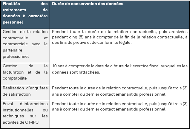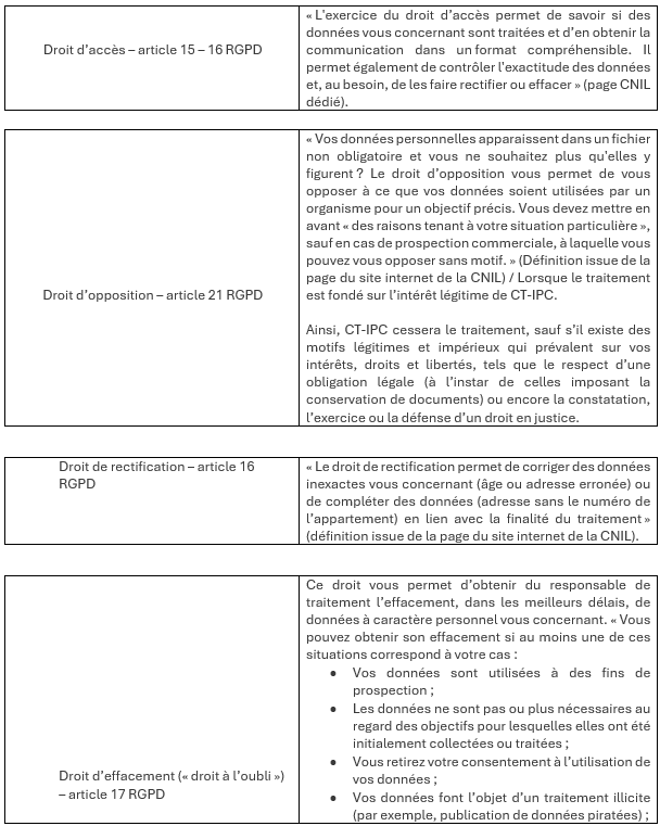 Traitement de données à caractère personnel mis en œuvre par CT-IPC en sa qualité de responsable de traitement