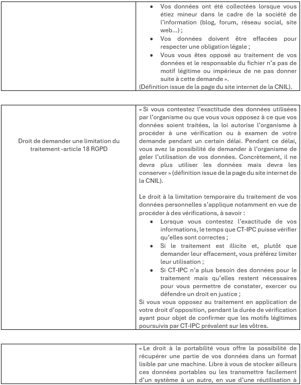 Vous êtes par ailleurs informé, conformément à l’article 13-1, b) du RGPD, que l’entité Mon DPO externe (https://mon-dpo-externe.com/) est désignée en qualité de Délégué à la Protection des Données (“DPO”) auprès de la Commission Nationale de l’Informatique et des Libertés, pour le compte de CT-IPC. Vous pouvez directement contacter le DPO via le formulaire de contact mis à disposition sur son site internet.
